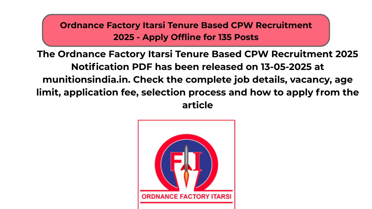 Ordnance Factory Itarsi Tenure Based CPW Recruitment 2025 – Apply Offline for 135 Posts