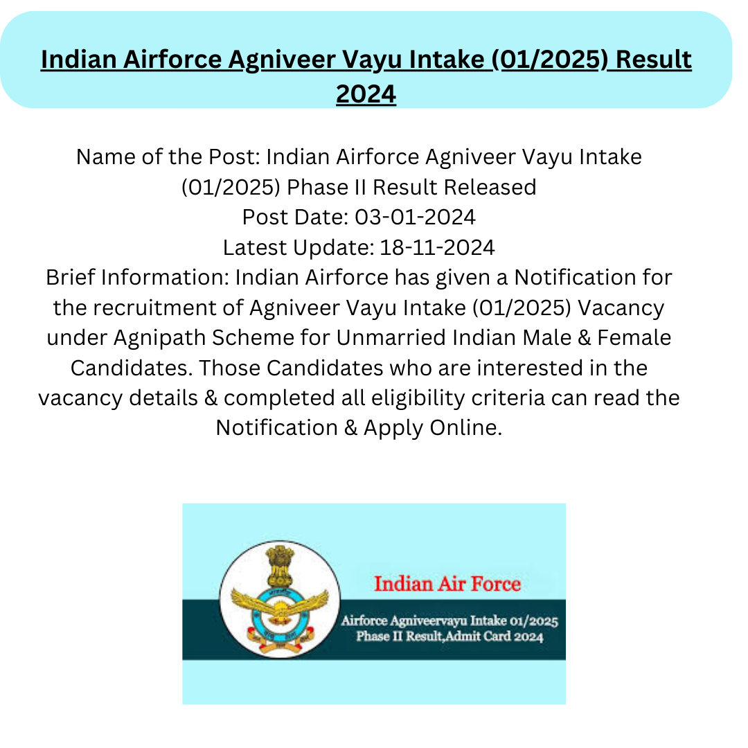 Posted On : 18 November 2024 08:14 PMName of the Post: Indian Airforce Agniveer Vayu Intake (01/2025) Phase II Result…