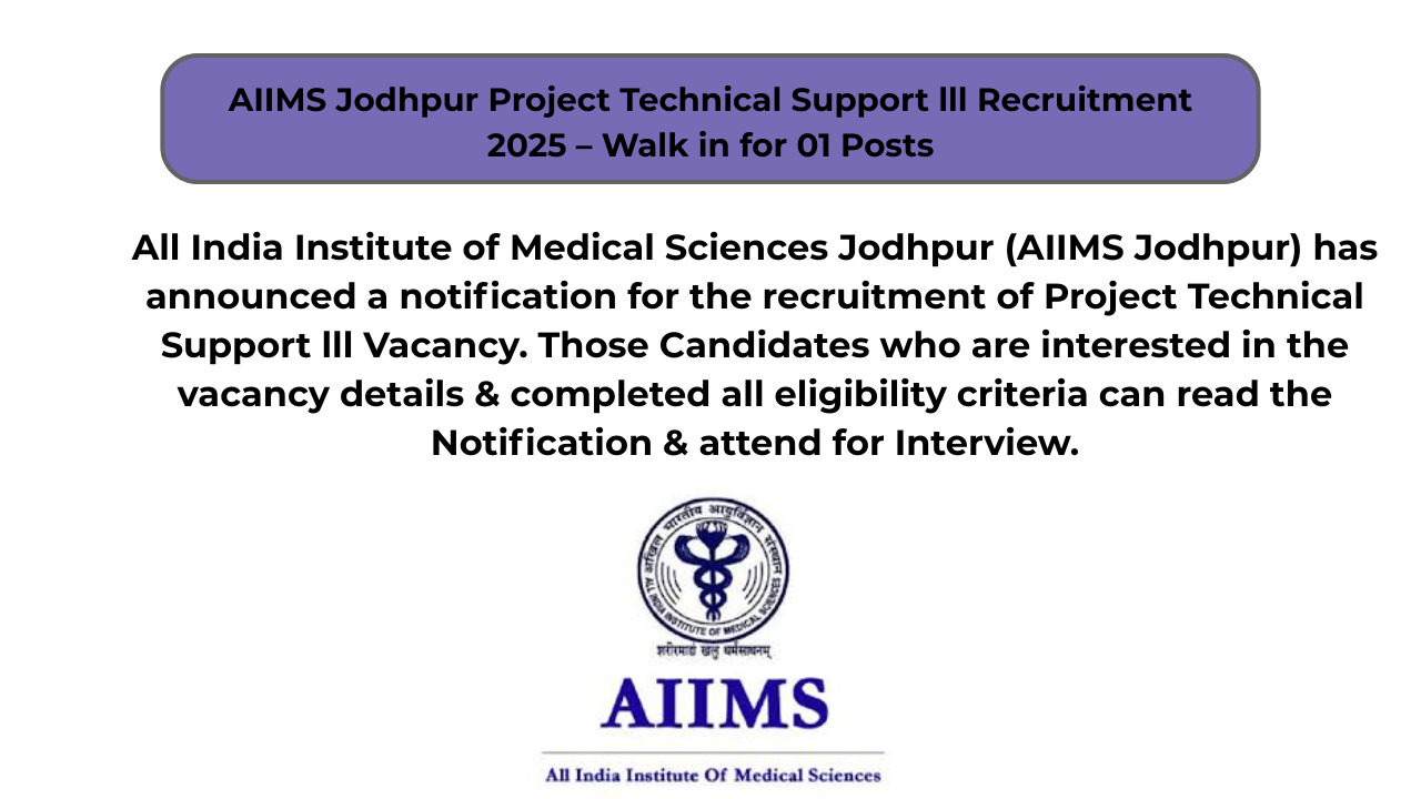 AIIMS Jodhpur Project Technical Support lll Recruitment 2025 – Walk in for 01 Posts