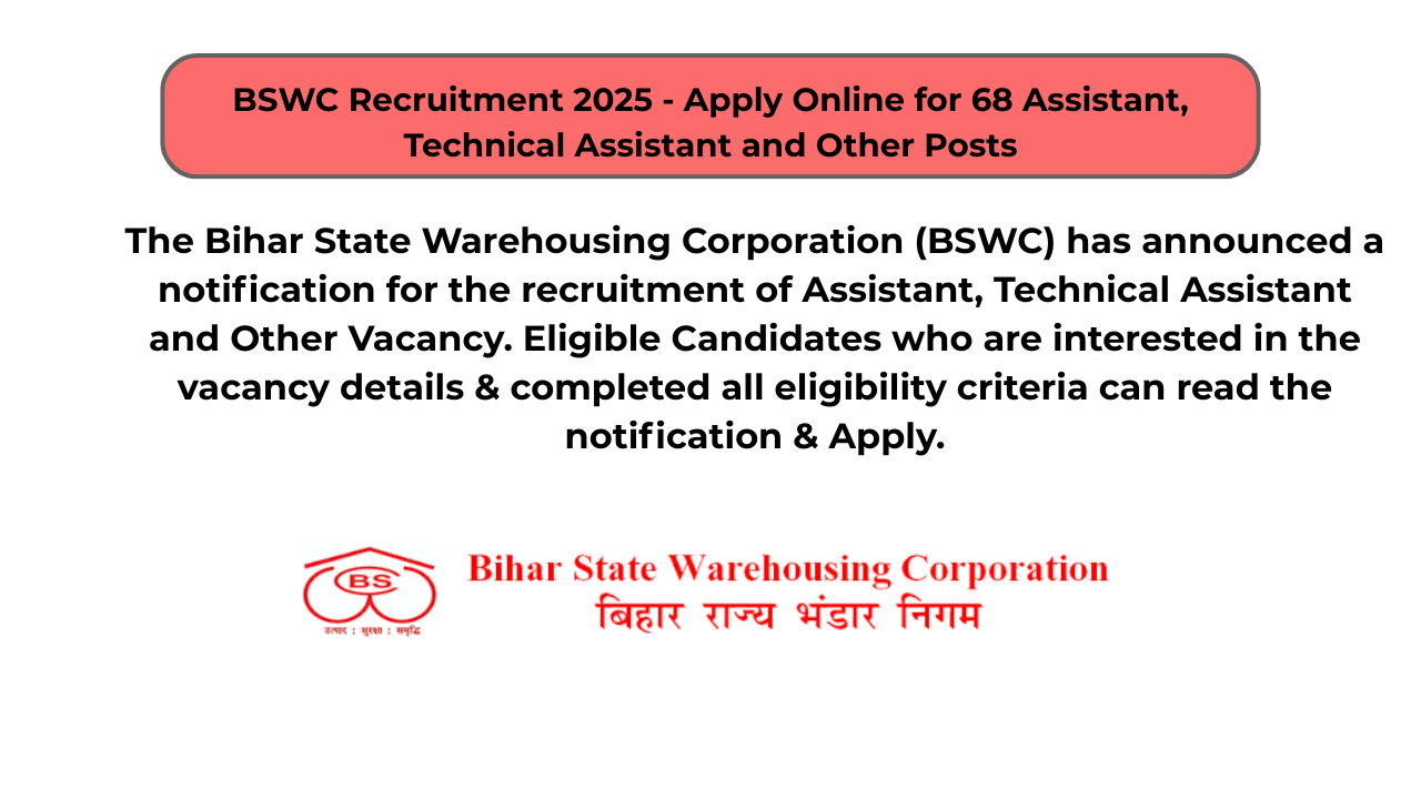 BSWC Recruitment 2025 – Apply Online for 68 Assistant, Technical Assistant and Other Posts