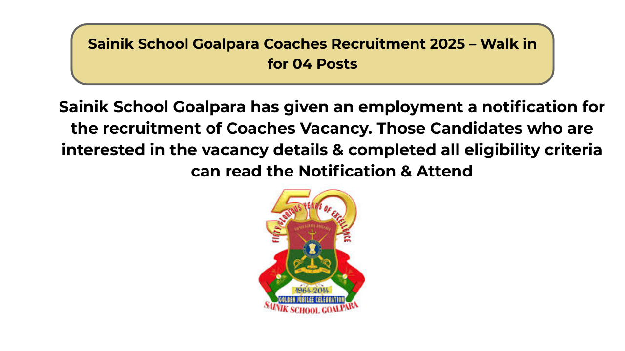 Sainik School Goalpara Recruitment 2025 for 04 posts of Coaches. Candidates with Diploma Can attend the walkin. The Walk-in on 21-05-2025.…