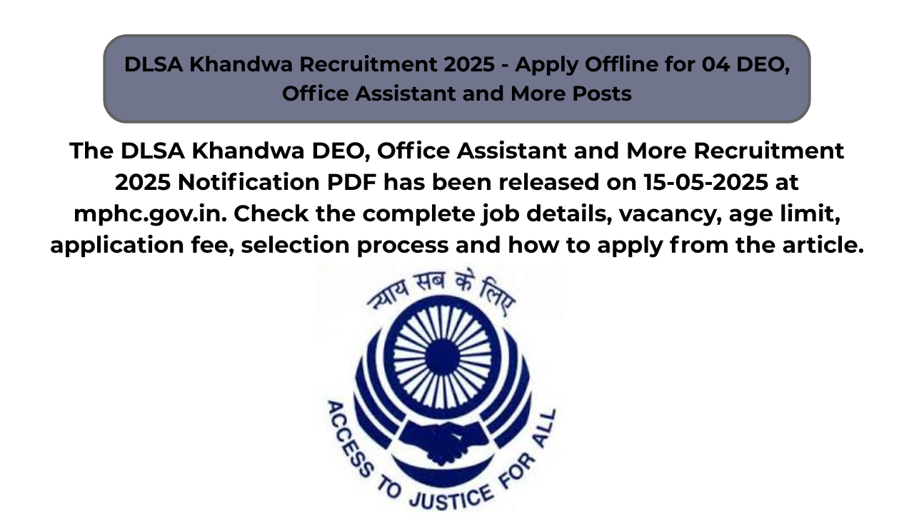 The District Legal Services Authority Khandwa (DLSA Khandwa) has released an official notification for the recruitment of 04 DEO, Office Assistant…