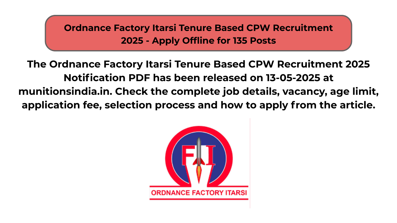 Ordnance Factory Itarsi Tenure Based CPW Recruitment 2025 – Apply Offline for 135 Posts