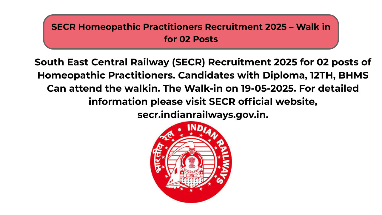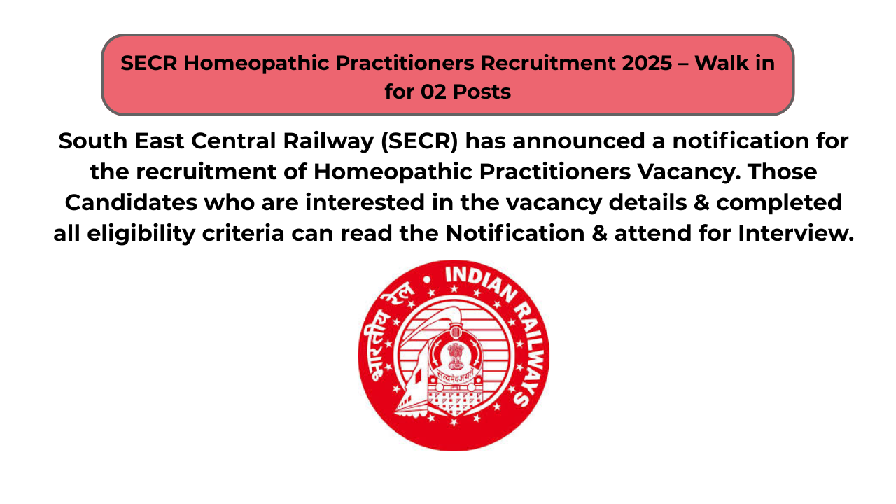 South East Central Railway (SECR) Recruitment 2025 for 02 posts of Homeopathic Practitioners. Candidates with Diploma, 12TH, BHMS Can attend…